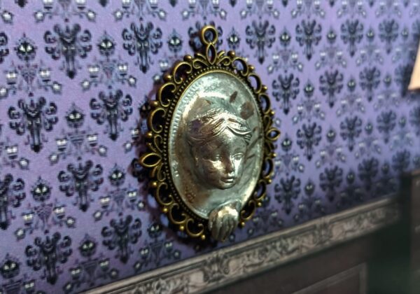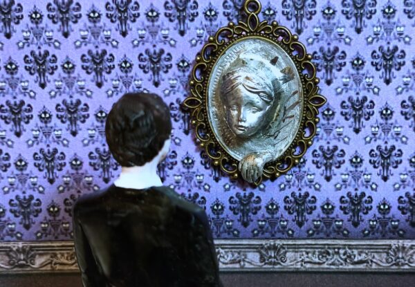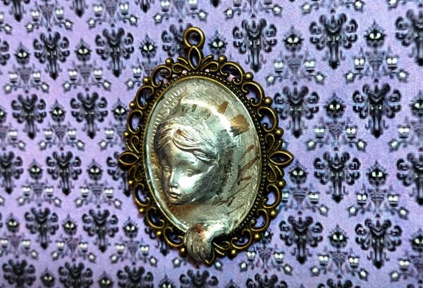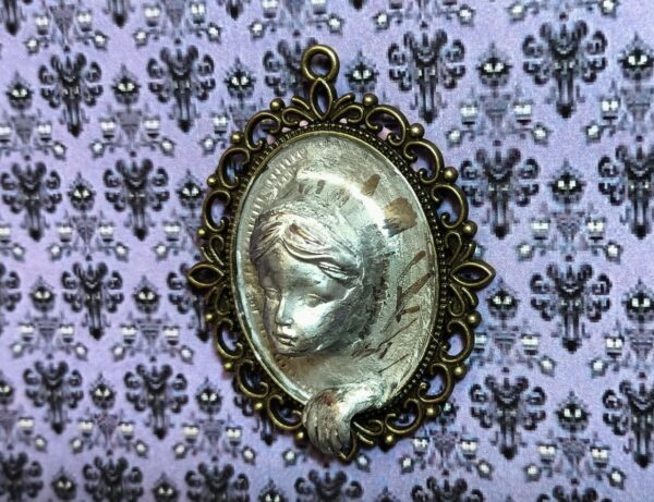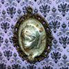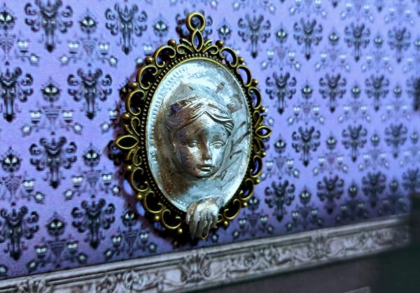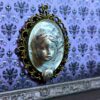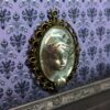 Una escultura inquietante con el rostro de una mujer emergiendo de un espejo. El hermoso rostro de la mujer está esculpido en arcilla polimérica sobre una base con marco de metal. Tiene una expresión apacible y parece observar con interés. Su mano, apoyada en el marco, también emerge del espejo. Creada especialmente para crear una atmósfera misteriosa, es ideal para una escena de Halloween, una casa de muñecas gótica, para decorar las paredes de una mansión encantada en miniatura o un diorama de temática misteriosa.